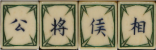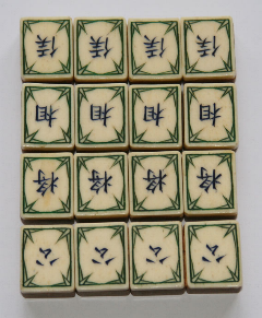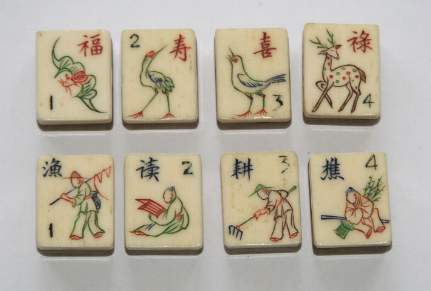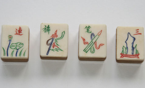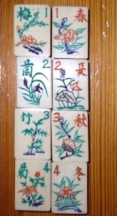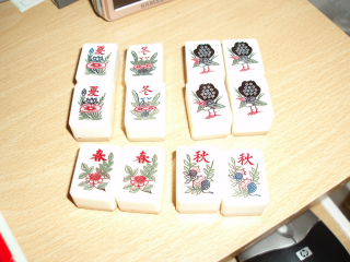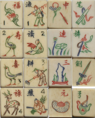 >The tile set for this game consists of two groups of tiles - wu hua pai ('cards with no flowers') and hua pai ('cards with flowers') - plus six blanks.