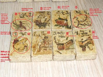 >The seven blank tiles need to be inspected for their dovetail joints. Their shape and size will usually determine to which tile set (wa hua or mahjongg) they belong.