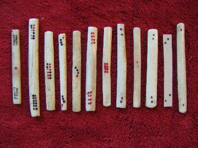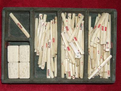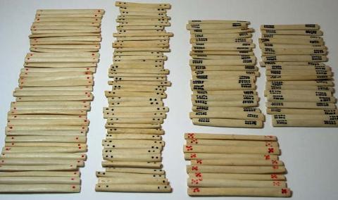 >Although Chinese dominoes are not my forte, I have taken an interest in one game - wa hua ('Digging Up Flowers'). My interest began when I noticed that two collectors of the earliest ma que (early precursor mahjongg) tile sets I have seen, also collected a bone and bamboo tile set for the game wa hua (for a complete set see Andrew Lo's chapter in 'Asian Games; the art of contest' by Mackenzie and Finkel).