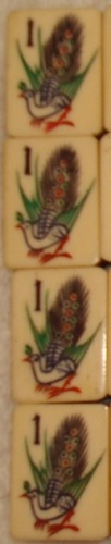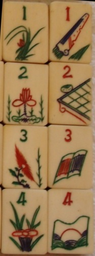 One thing I notice in this photo, though, is that your flower tiles are whiter than your other tiles. That makes me wonder why. Maybe those tiles are made from higher-quality bone (not unreasonable, since the manufacturer wanted those tiles to be pretty), or maybe those tiles were not used much in play? I can't tell from just a photo.