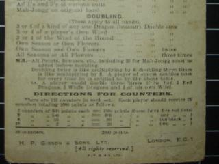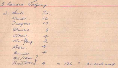 >I now attach the handwritten card that is in the box. No rules - just a list of the tiles required for 3 Handed Mahjong. This calls for 4 Animals (perhaps the Tiger, Hare, Dragon & Monkey) and "Fish/Man/Priest/Urn" (Fisherman, Fish, Rich Man & Crock of Gold); also 4 Jokers, 4 Roses & 2 'Tim Yong'. The two 'tokens' in the set are single sided just as you saw them in the scan. Note also that this version calls for the use of two suits (72 not 36 as in your version).