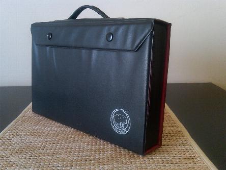 >08. Container: reddish brown faux alligator case with plastic handle. Green felt in the top. Two closures either side of the handle with locks.