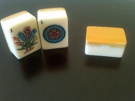 >Sorry, no Tom. I think it is possible that the staining was a result of someone ageing the bamboo bases at the time or just before the bone tops were inserted into them, that is, at the time of the faking procedure. I don't think it was an attempt by a previous owner. I have seen a couple of sources mention that soaking them in tea and burying in dirt for some time are a couple of ways of artificially aging the tiles. However, I have no personal experience of this.