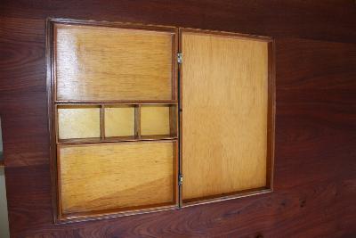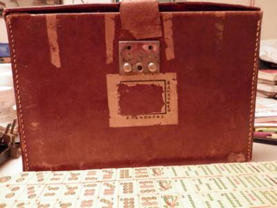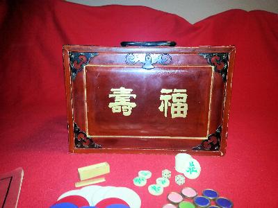 > 5: The box is highly lacquered with painting on the sides and hardware on the corners. It has 5 drawers, the top three are for the tiles and the bottom is divided into 4. It is missing the "doodad" from the lower right corner of the top and the upper left corner of the right side. It is also missing one handle.