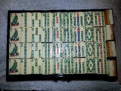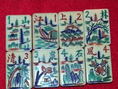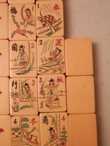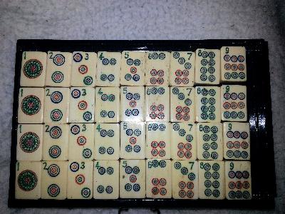 > I just found a remarkably similar set at mahjongmahjong.com in their museum. The only difference that I can see is that my dragons have no letters on them and my flowers are numbered rather than designated N,S,E,W. The Bams are exactly as are the craks, Unfortunately the museum doesn't give an age. If you are interested, they reference it BB8.