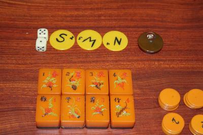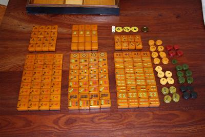 As for your set's value. First I have to digress and tell you about the bits that do not belong (and you should remove them). All the colored discs are add-ons by the set's previous owner -- you can put them in some other board game. They do not belong in this set. You said there are 6 dice; the 2 larger ones were added in by the set's previous owner. You can leave those with the set (they're more pleasant to use than the original tiny dice). You also have a 1940 NMJL card that does not belong with the set -- it's worth money to a collector on its own (maybe $15-20? I don't know).