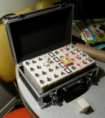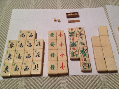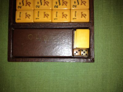 As I wrote in FAQ 7H, condition is everything. You didn't tell me the condition of your items (and I can't determine condition from photos alone), so I have to assume they're just "Good." And I have to assume that this is everything. There is no wood box, no paper booklet, and no wind indicators or mingg cylinder (just the black mingg lid). So the set is woefully incomplete. It's a set of tiles, racks with score tables, sticks, a complete dice coffin, all in Good condition. Your question is value. I'd say perhaps $50 or thereabouts -- far less than a typical (and complete) standard 1920s set.