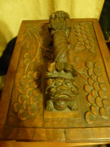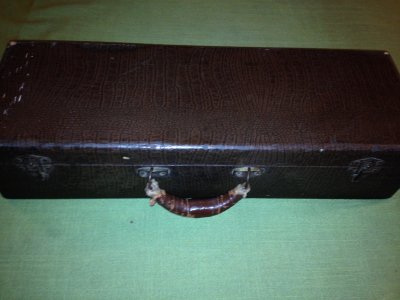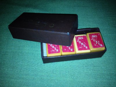 >I enclose some photos. There are 157 tiles, 119 sticks, dice, etc. It looks to me like a standard (if there is such thing) bone-and-bamboo set from the 1920s. The tiles have the shallow dovetail described in your FAQ page. The back of the holders is inscribed “Carter’s Improved Scale and Doubling Score,” and “Series 107 Copyright 1923 by The C & G Company, San Francisco, Calif.”
