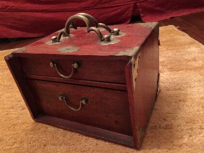>It comes in a wooden box with 2 drawers and a slide-in front which is missing. The top drawer is in very good condition. The bottom drawer is in poor condition. The back of the box is in poor condition. The box itself (except for the back) is in very good condition. The brass is all there and in good condition.