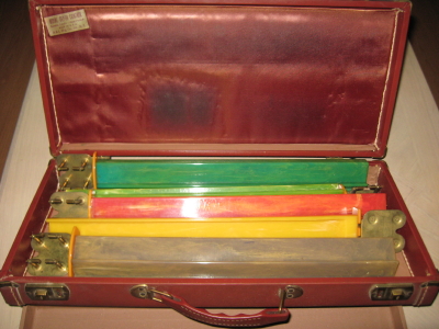 >The leather-like case has a key, 2 wooden trays and 5 Bakelite racks.
