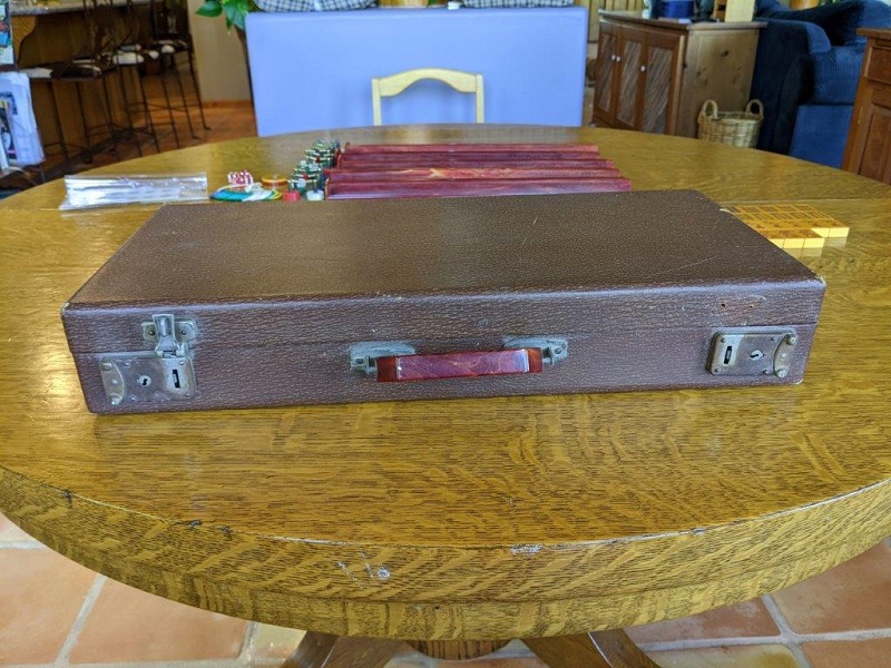 From the photo of the outside of the case, it looks like there are flaws or abrasions. You didn't say what condition the wind indicator, dice, chips, and racks are, or how many chips there are. I'm going to guess that the set is in Very Fine condition: "Item may have chips, dings, dents, cracks or scratches and maintains 80 to 85% of new condition." And I'm going to guess that you could get between $150 to $250 for the set. Good luck with the sale!