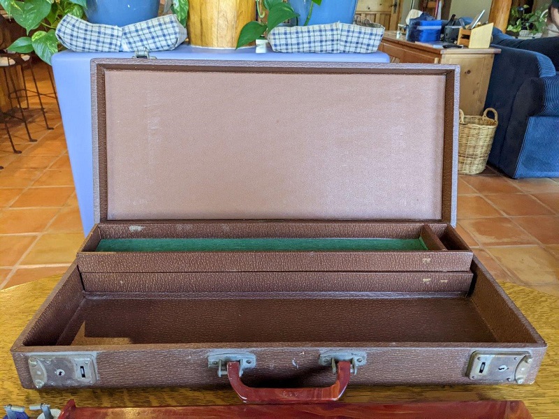 The set is in a leather look case in decent condition with an E.S.Lowe NY , Exclusive LOWE Creation tag in the top left hand corner of the lid. It has a few white paint marks on the top of case. It has brass latches with locks but there is no key to the case.