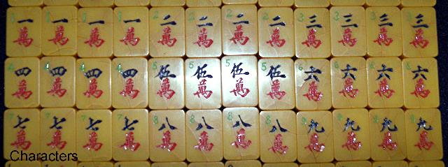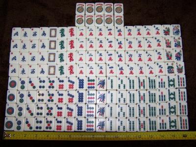 >>6. How many tiles... exact breakdown... Flowers 8; dragons 12; winds 16; bamboo 36; circles 36; characters 36, 10 jokers; 154 total tiles. 2 dice.
