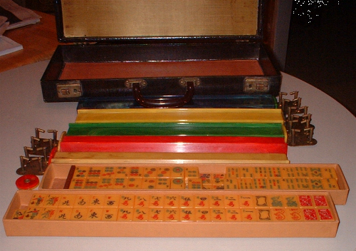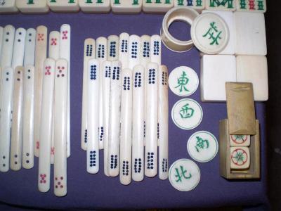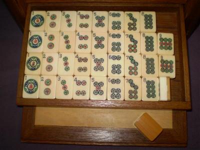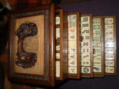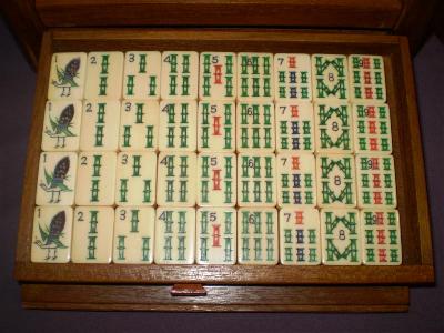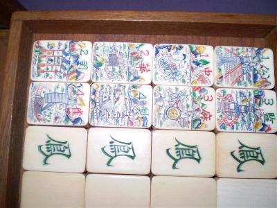 >I’m delighted to find your site it’s proved very informative - I’ve been up all night reading it J. I was fortunate enough to purchase an ivory & bamboo Mahjong set in the late seventies and have never seen another like it since. My sister and I were discussing how we could find out more about my set as she loves it too and would like to find something akin to it for herself. It was purchased locally (New Zealand) from an antique dealer and I was sold on the spot – I had seen several second hand sets prior but nothing like this one. I was told it was almost 100years old at the time (from your examples it could be more like early 1920’s) and that the Bi-coloured carved wooden box is made from Japanese timbers - that was all that the dealer could tell me. I think the whole set is of early Japanese origin and the tiles are in beautiful condition. The box has a little external damage and a crack on the lower front door panel (inside). My son and I do play occasionally but not as much as we would like. We still have a lot to learn and I am still a little lacking in the correct terminology.