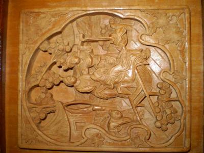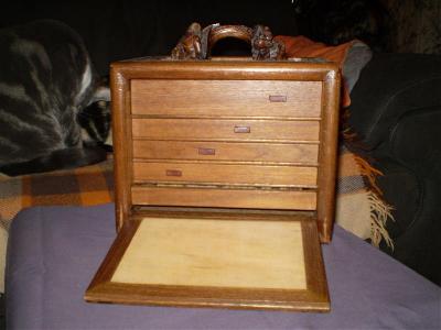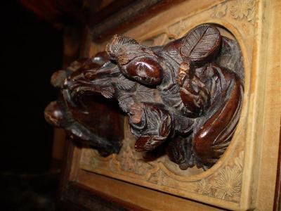 >· The box = carved on four faces including the lid and handle; cube style box with five internal drawers; two timbers used in its manufacture; carvings intricate and very detailed – did I repeat myself there? No makers mark inside or outside the box unless subtlety included in the carvings some how. I’m hoping that its origin comes to light either via the characters on the tiles as you suggested could sometimes help or by way of its carved exterior as the recognized work of some early artist.