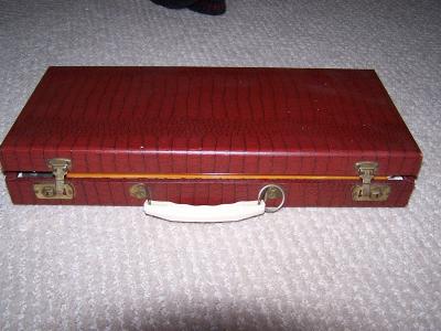 >>7. Container... red faux alligator print, good amount of wear, brass hinges with lock and key, opens like a suitcase.
