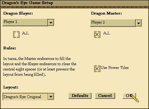 On the Dragon's Eye Game Setup dialog, choose whether you want to be the Dragon Slayer or the Dragon Master.
