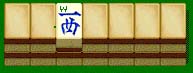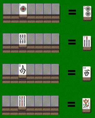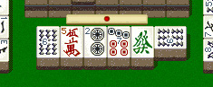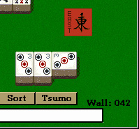 In the center of the screen is the Dead Wall. The Dead Wall is the last 7 stacks of tiles in the Wall (14 tiles); in the game this is represented by 7 tiles. The tile at the top of the 3rd stack from the end is turned face-up. This tile is the Dora indicator. "Dora" is explained elsewhere in this guide. Japanese Mah-Jongg limits the game to a total of four Kongs, which is why the Dora tile is the 3rd from the end of the Dead Wall. When a player makes a Kong, a tile (called a "loose tile") is taken from the left end of the Dead Wall. Because the game displays one tile to represent a stack of 2, you will see the end tile disappear after 2 Kongs have been made.