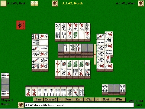 Your opponents' names are arrayed across the top of the screen. In the center of the screen is the Dead Wall, and one tile is turned face up. That face-up tile is the Dora indicator. The number of tiles in the Wall (including the Dead Wall in the center of the screen) is shown at the lower right corner of the screen.