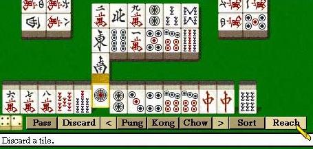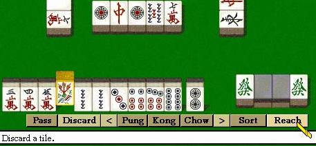 Reach - The Win button says "Reach" and lights up when the player is holding a fishing (calling) hand and an appropriate discard is highlighted. Let's say you have a fishing (calling) "Pure" hand ("Chinitsu")-all Bams and one Dot. When you have the sole Dot tile highlighted and raised, the Win button says "Reach" and lights up. But if you move the highlight off the Dot tile, to a tile which if discarded would not leave you with a fishing hand, then the Win button becomes unlit (but still says "Reach").