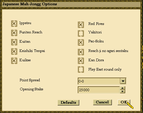 The options are already set to their recommended settings. These settings are recommended because they are either usually played this way by most Japanese players or because they are the friendlier settings for those new to Japanese Mah-Jongg.