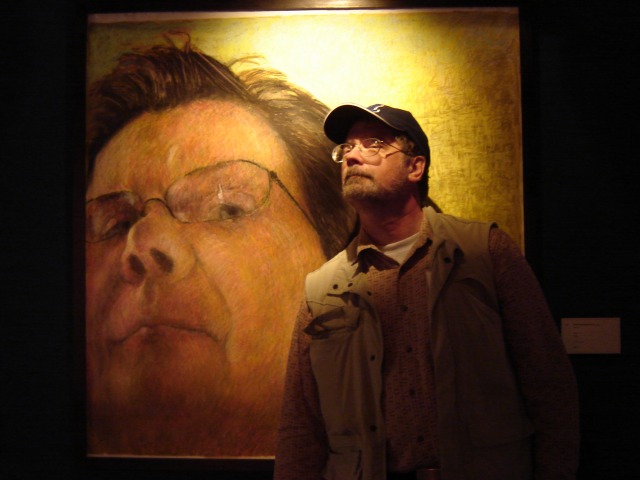 Yuri Tezuka pointed out that this painting looked just like me, so I got her to take this picture. Shoulda shaved. Shoulda took off my hat.