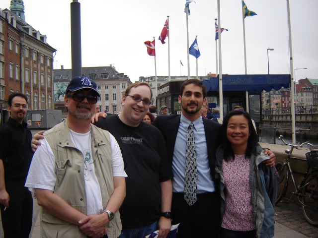 The very first meeting of the full U.S. mahjong team ("Mahjong USA"). Left to right: me (Tom Sloper), Andrew Feist, Benjamin Boas, Josephine Lee Moore.