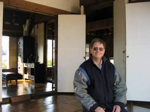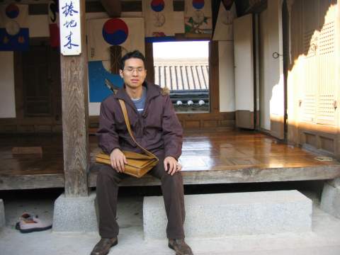 Taesun rests at a house decorated with Korean-style kites. Photo by Earny.
