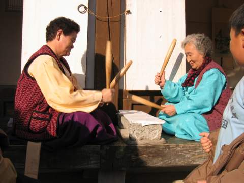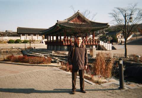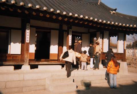 Namsangol has a number of old-style Korean buildings. Although it was pretty cold that day, there were lots of visitors at the village. Taesun and Earny are seen here getting a look inside, together with a family group.