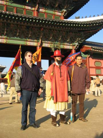 We saw the changing of the guard ceremony. Here are Taesun and me, mugging with a guard.