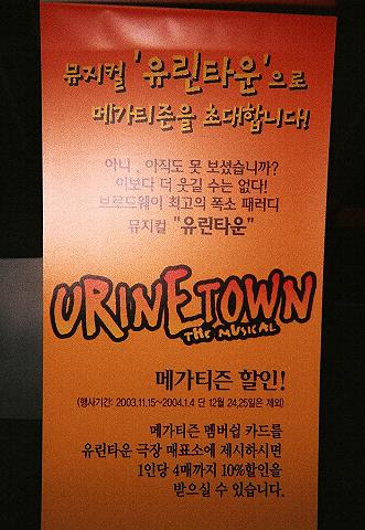 I went to see a movie, Kill Bill, at Coex's Megabox Cineplex. The film was mostly in English, with Korean subtitles. There were no English subtitles, so I had to fend for myself when the actors spoke Japanese or French (luckily, my two best languages other than English). At the Megabox I was struck by this poster for a musical.