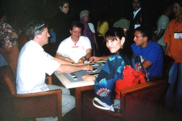 This hand earned him not only Knitted Straight for 12, but also All Types for 6, and the Dragon for 2. And whatever he might have earned for the final tile (I don't recall that detail); call it 20+. It was surprising to me, because I'd never seen this particular combination, and when I gave a querulous look to Mai, she nodded her agreement that these were all proper claims. I think she wasn't quite as surprised as the rest of us were (including our referee, Ma Prem Sohana, who, coincidentally, was my gracious host in Nijmegen).