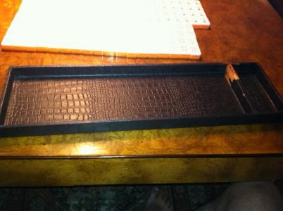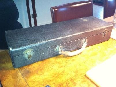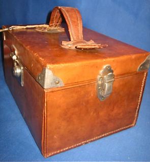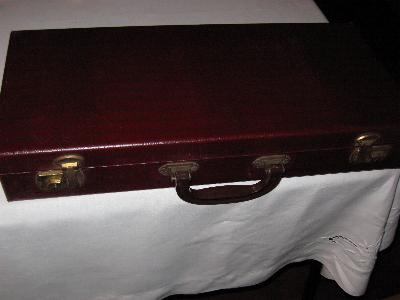 >08. Container: reddish brown faux alligator case with plastic handle. Green felt in the top. Two closures either side of the handle with locks.