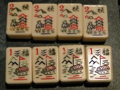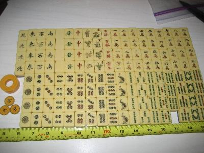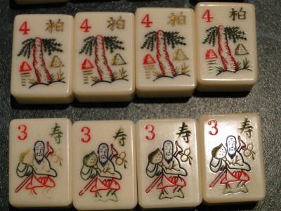 Your estimate of the set's age is interesting as well. Guess the set isn't as old as it looks! I thought the carving style of the dots looked rather old, but that was countered by the style of the craks, 1B, and fa and chung tiles. The absence of the flowers is a small mystery too. Anyway, my estimation of the set's value is lower now.