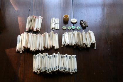 >Sorry, no Tom. I think it is possible that the staining was a result of someone ageing the bamboo bases at the time or just before the bone tops were inserted into them, that is, at the time of the faking procedure. I don't think it was an attempt by a previous owner. I have seen a couple of sources mention that soaking them in tea and burying in dirt for some time are a couple of ways of artificially aging the tiles. However, I have no personal experience of this.