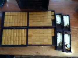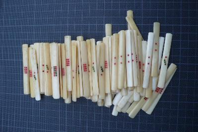> 7] Apart from the tiles, the set consists of a box (see 8/9), four racks and an incomplete set of sticks. The four wooden racks have the simple L-profile. Their length (40 cm) is too long for the "small" tiles, so my father notched them at the 18-tile width. The bone sticks measure 70 x 8 mm and count: