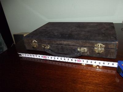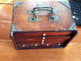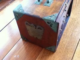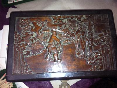 > 9] The lid of the box has been reinforced on the inside with a piece of formica. Apart from that it looks like it always did: deep brown varnish with green and white characters (meaning unknown).