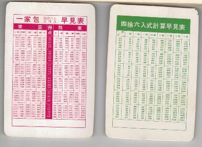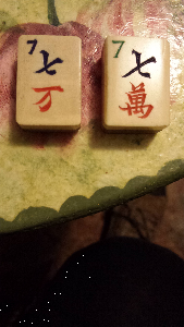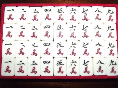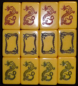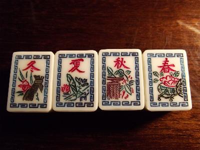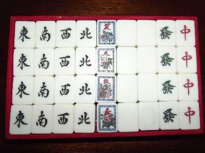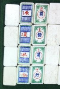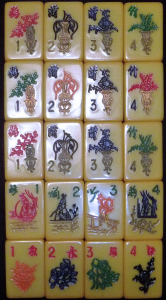 > 6] The basic 136-tile set is complete. Added are 8 flowers (four depicting 1/rich man, 2/pot of gold, 3/monkey king, 4/goddess of mercy; the other four depicting 1/plum, 2/orchid, 3/bamboo, 4/chrysanthemum), 4 extra blank tiles (equivalent to white dragons) and THREE joker tiles (obviously one joker tile was lost during one of those many nightly games; this was not essential to them because they, like me, played/play the Chinese Classical 144-tile game).