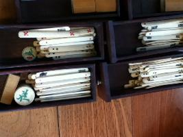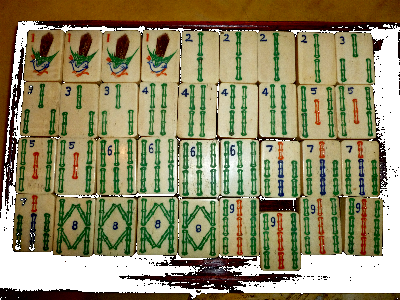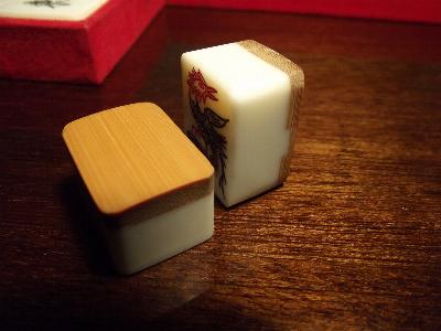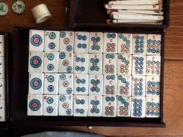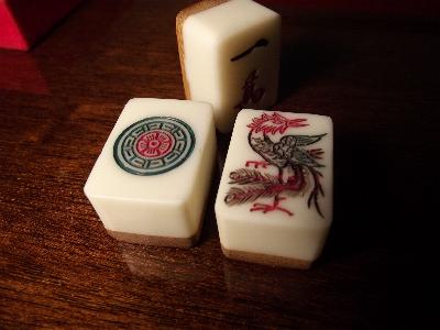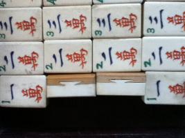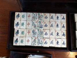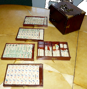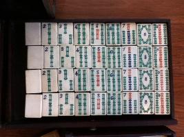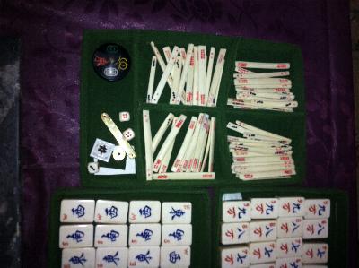 > 1] The set consists of 151 "small" bone-and-bamboo tiles (a 152-set missing 1 joker) in a flat wooden box, an incomplete set of bone sticks and four wooden racks.