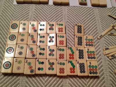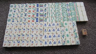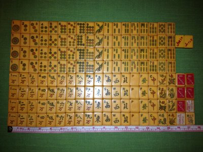 As I wrote in FAQ 7H, condition is everything. You didn't tell me the condition of your items (and I can't determine condition from photos alone), so I have to assume they're just "Good." And I have to assume that this is everything. There is no wood box, no paper booklet, and no wind indicators or mingg cylinder (just the black mingg lid). So the set is woefully incomplete. It's a set of tiles, racks with score tables, sticks, a complete dice coffin, all in Good condition. Your question is value. I'd say perhaps $50 or thereabouts -- far less than a typical (and complete) standard 1920s set.
