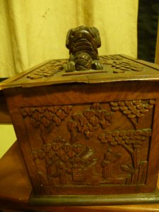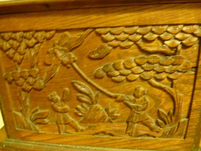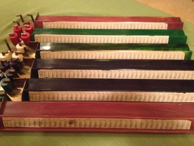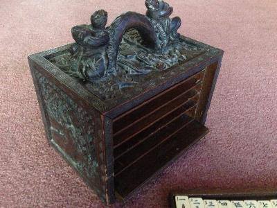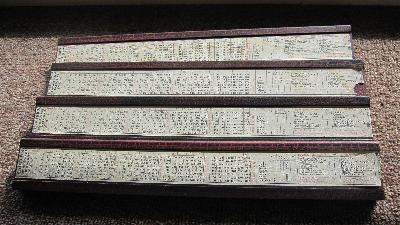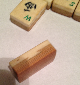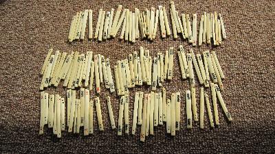 >I enclose some photos. There are 157 tiles, 119 sticks, dice, etc. It looks to me like a standard (if there is such thing) bone-and-bamboo set from the 1920s. The tiles have the shallow dovetail described in your FAQ page. The back of the holders is inscribed “Carter’s Improved Scale and Doubling Score,” and “Series 107 Copyright 1923 by The C & G Company, San Francisco, Calif.”
