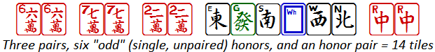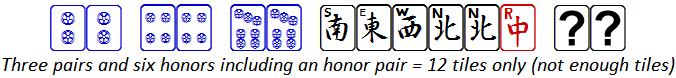 If you made three pairs, plus 4 single honors, plus an honor pair (6 honors including an honor pair), that leaves you needing 2 more tiles - what would those 2 tiles be?