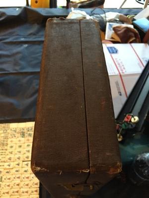 Although the pieces look like typical 1920s examples, the box is atypical (having just 2 drawers). Let's be conservative and say that the book is original to the set, and call it late 1930s. (But it could well be 1920s.)