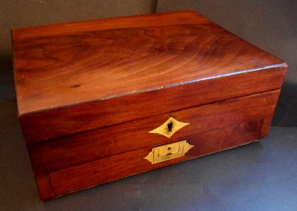 >It comes in a wooden box with 2 drawers and a slide-in front which is missing. The top drawer is in very good condition. The bottom drawer is in poor condition. The back of the box is in poor condition. The box itself (except for the back) is in very good condition. The brass is all there and in good condition.