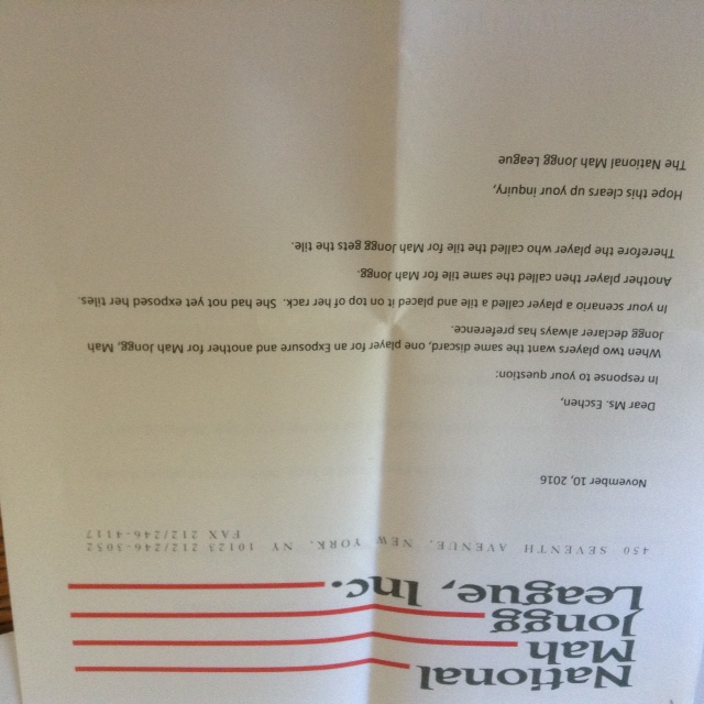 >So in reading #2 it seems that you can call a discard, put it on top of your rack and then put it back as long as you don’t expose any other tile? Then I remembered you had posted a letter from NMJL that said.