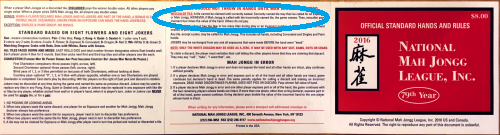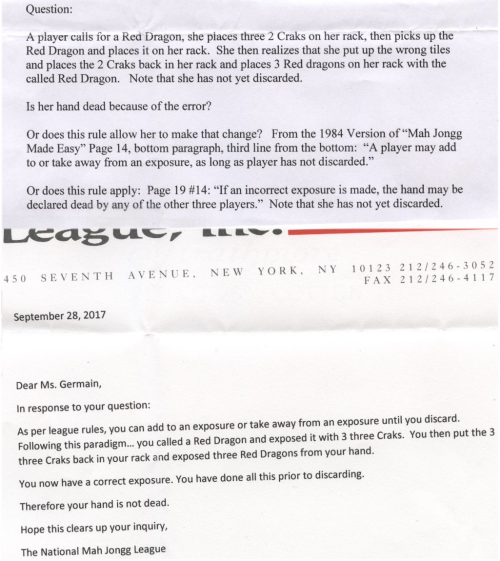 >Tom, I think you misread my account. It was a tournament. Someone threw a flower, but said white dragon. Another individual called mahj on the white dragon....but...it was a flower! The judges awarded the mahj anyway. Meaning the judges counted the flower as a white dragon!! Reading the rule on the back of the card makes this incorrect. The tile discarded must be identified correctly for there to be a mahj or an exposure. Right?