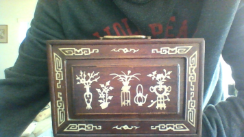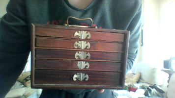 >Here is a picture of the tiles and a little bit of the cloth-covered case they came in.