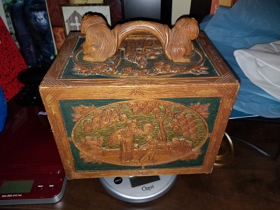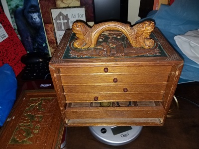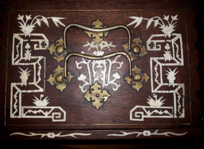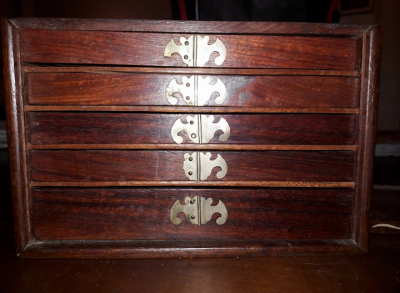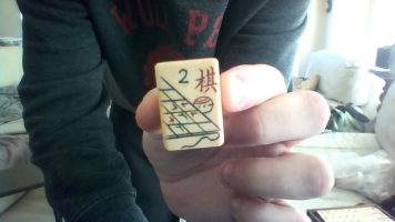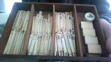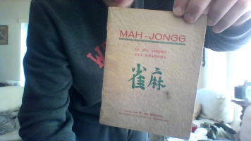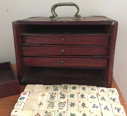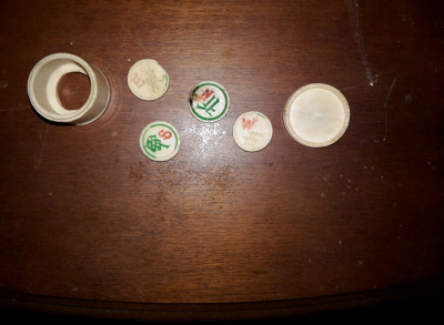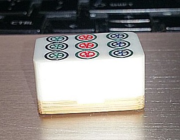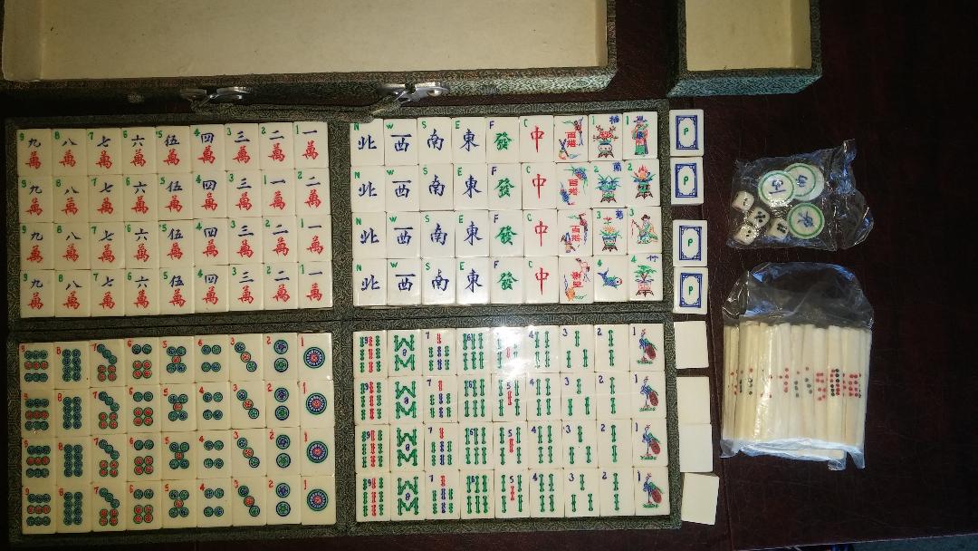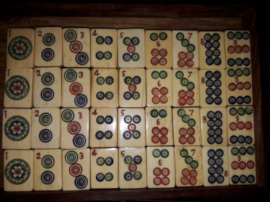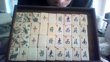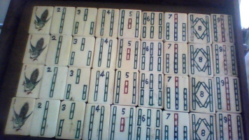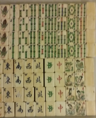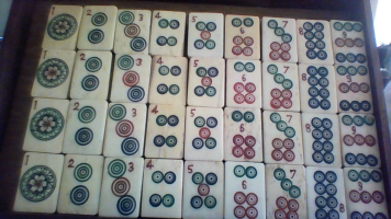 >It was bought in China, so I assumed it was Chinese, but it has American-style numbers and letters on the tiles. The tiles are bone-and-bamboo. It could be a 1920 Chinese set, but it was bought in the last 10 years, and it has 152 tiles (1"x3/4"x1/2"), 4 of which have rectangles on them, and 4 of which are blank. It also has counting sticks and dice(4) like a Japanese set! Plus 4 circular markers with wind symbols. It has no racks or circular disks with holes in them.
