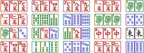 "Three "mixed chowers" (eg bamboo 1, characters 2, and circle 3), a pair of winds and a pong in dragons or vice versa."