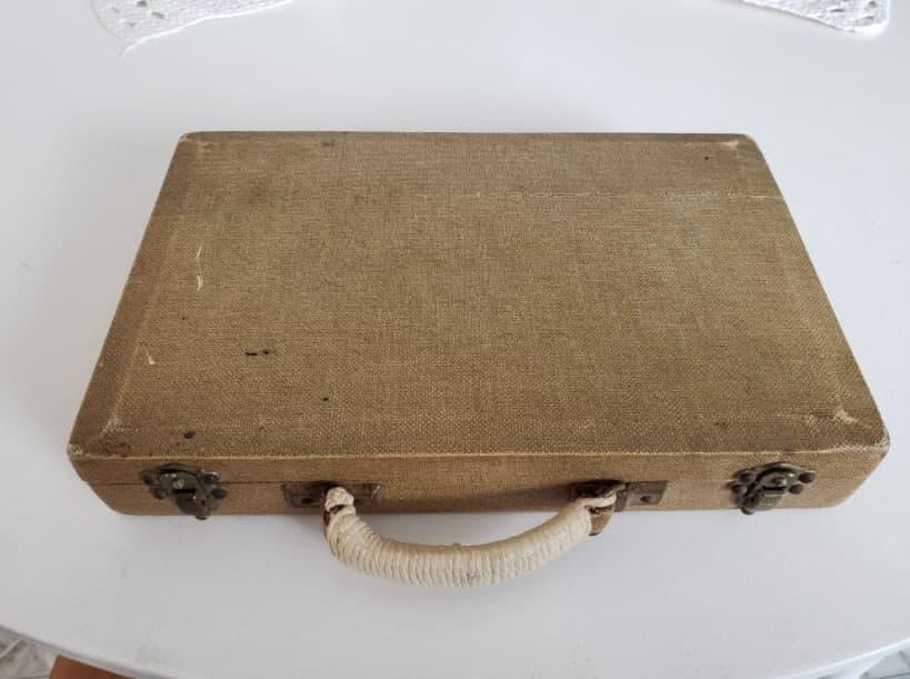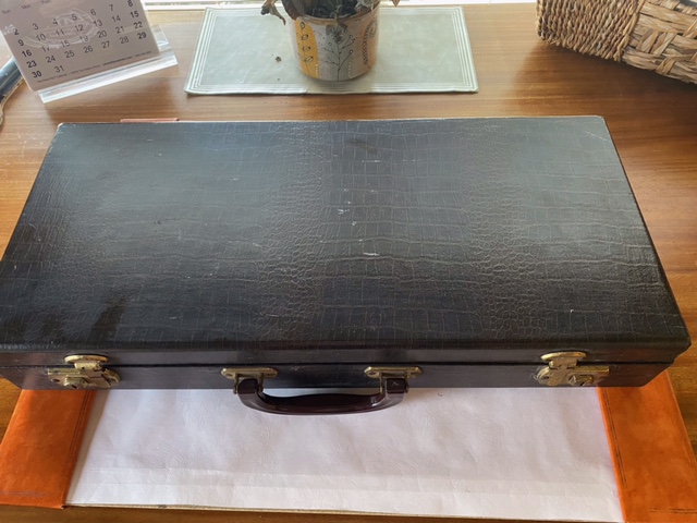 The set is in a leather look case in decent condition with an E.S.Lowe NY , Exclusive LOWE Creation tag in the top left hand corner of the lid. It has a few white paint marks on the top of case. It has brass latches with locks but there is no key to the case.